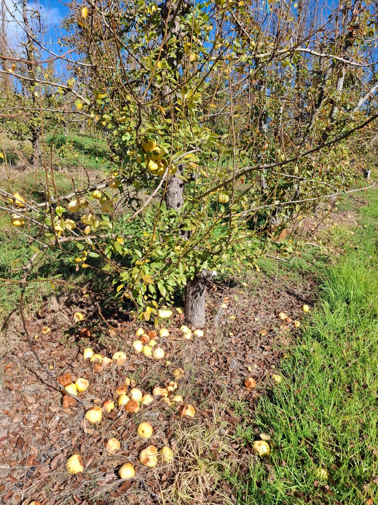 Took this photo at the orchard this week! … it’s a “Josephine” pear tree, and it was left unpicked… the harvest was never reaped and the fruit is now overripe and useless as all the fruit is falling or has already fallen off and now rots away into the ground!